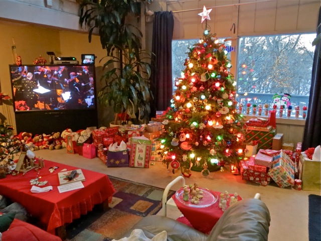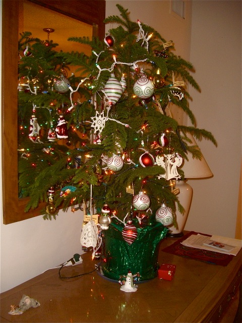 After I had written the above I found this picture of our 2007 Christmas tree while we were in Indonesia. The tree and lights were already in the apartment but we added some ornaments including the Charlie Brown nativity.