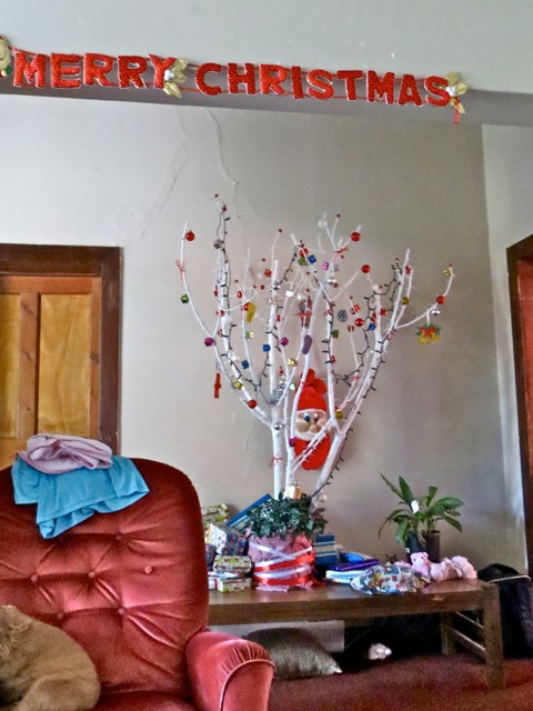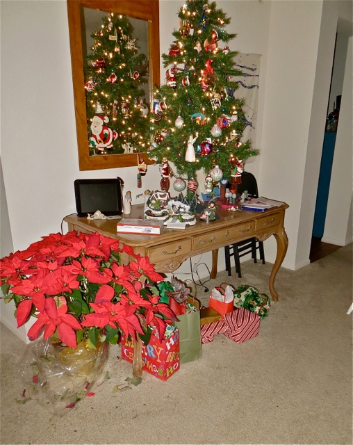 Christmas 2013 found us at home with snow on the ground and our family Christmas tree brightly lighted for Christmas morning. In 2012 we were in Florida and we found a small pine and Costco poinsettias.