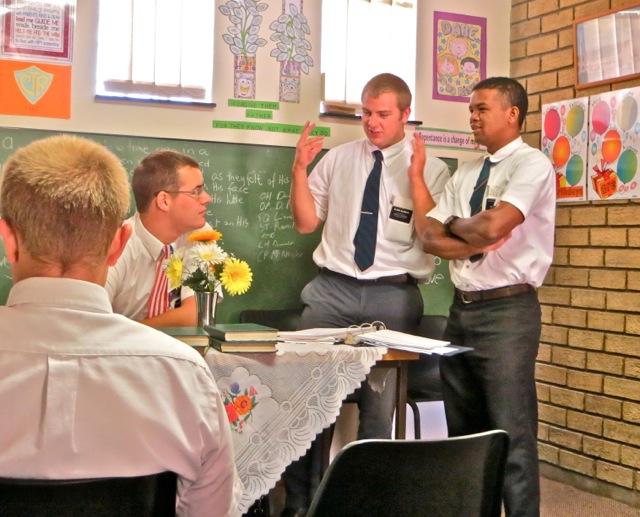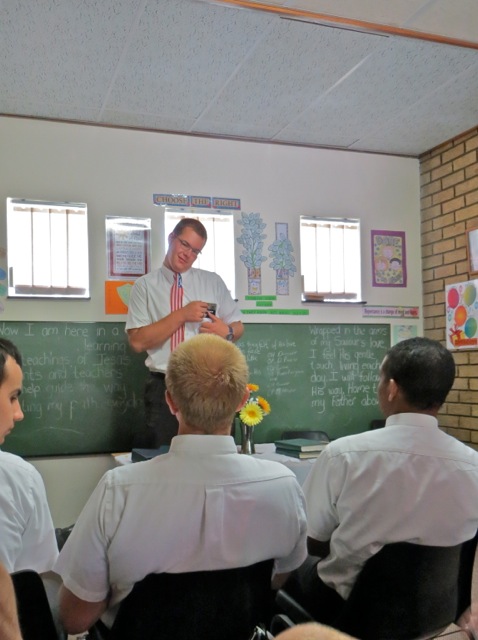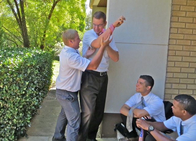 Friday is of course district meeting and elders Taylor, Liera and Oldroyd were talking on the front steps when elder Taylor took elder Oldroyd’s name tag. As you can see Elder Taylor is about 8″ taller and a few pounds heavier than elder Oldroyd.