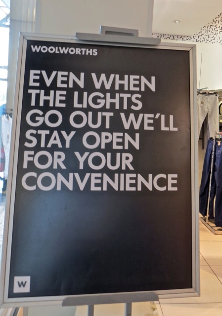 Load Shedding is the term they use here for rolling blackouts due to a shortage of electricity. It seems to be a big problem this year due to both demand and lack of capacity. The sign below is from Woolworths which although in a mall that sometimes goes dark has it’s own generator. The elders like to eat at a Chinese place near our flat that cooks with gas instead of electricity so they can provide hot food even when the lights go out.