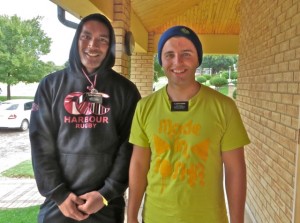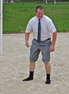 Departing missionaries Kolditz and Stapley get serious and roll up their pant legs before the start of the traditional volleyball game between the arriving and departing missionaries. Â