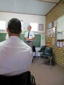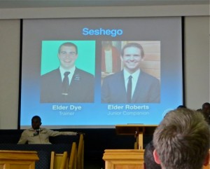 We are always happy to see elder Harris who served in the Ikageng district with us. Elder Matos – wearing a suit coat because he will soon be departing greets elder harris. Elder Reese – who was released as one of the Vaal Zone, zone leaders – looks on with a smile.