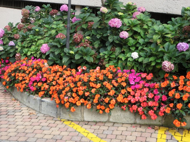 Before we went to the mission office we stopped by the distribution center on the temple grounds. I always enjoy the quiet beauty of the area next to the center and area office as the path wanders through a small tropical paradise with a lovely flowing stream. The bank of impatiens added color to the area near the area offices.