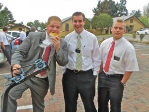 Elder Harris gets in another picture with elders Holmquist and Compton. Elder Compton was district leader when we first came to Potch and the Ikageng District.Â