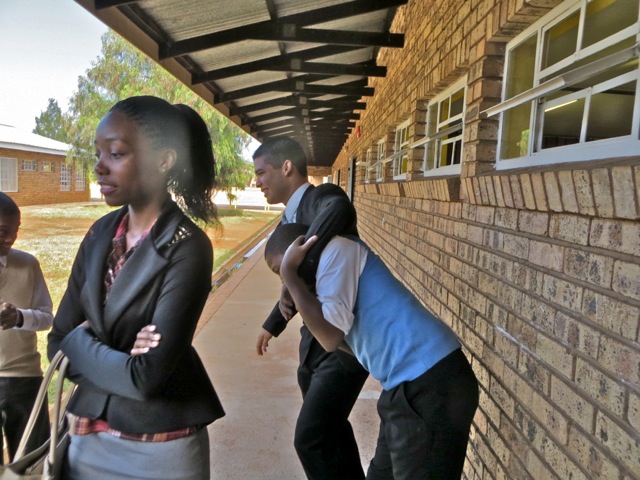 Elder Liera is showing Papa Thulo how to be a good missionary – in this case how to make sure an investigator does not walk away before they give their name and phone number. Actually of course Papa was giving him a hard time and tried to take his African lapel pin.