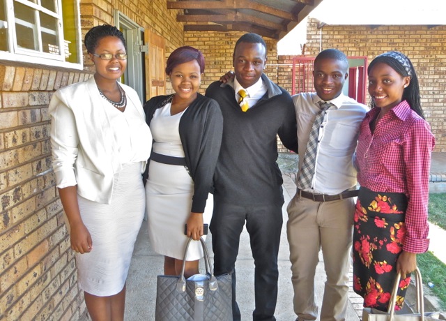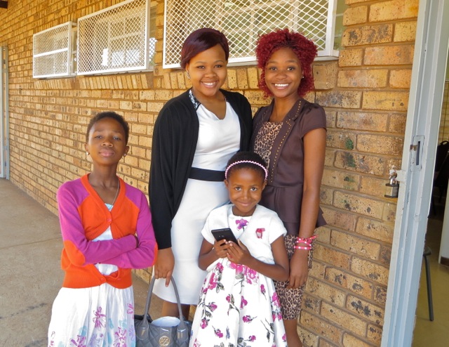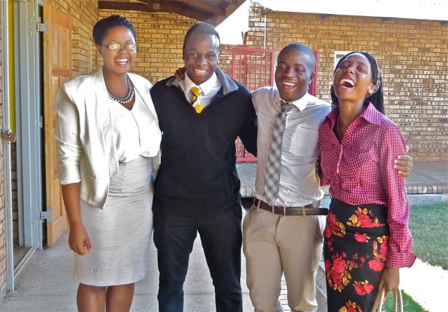 Sisters Kea and Ntabiseng share a picture with the young Kujane sisters who love to have their picture taken. I caught four of our great YSA together – Sisters Neo on the left and Thato bookend brothers Tinashe and Kenny.