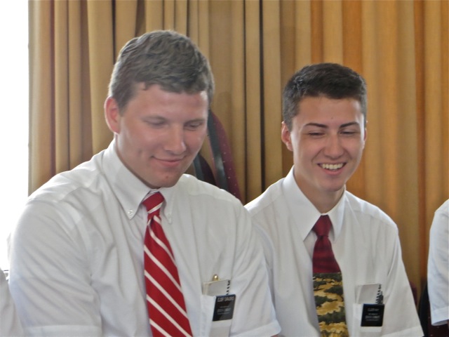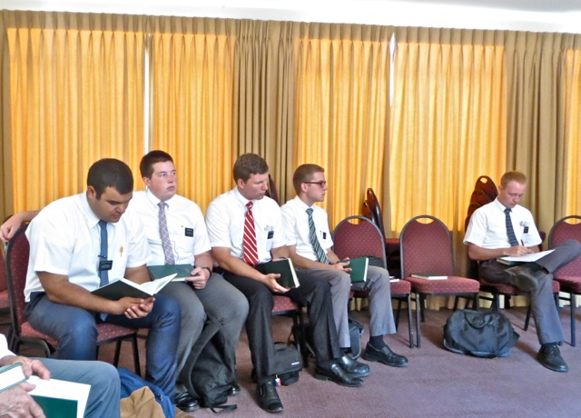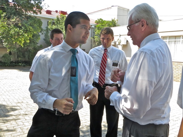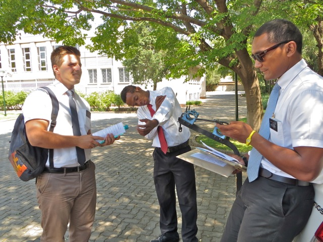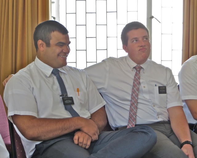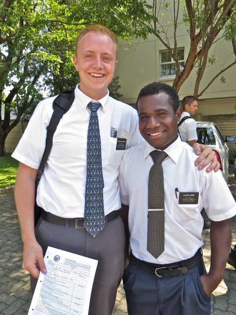 I got a couple of pictures of elder Alvial – first posing as Fan Man with sister Kea trying to sneak by without being blown away by his super fan and then with sister Lydia – notice the distance between them – carefully keeping mission rules.