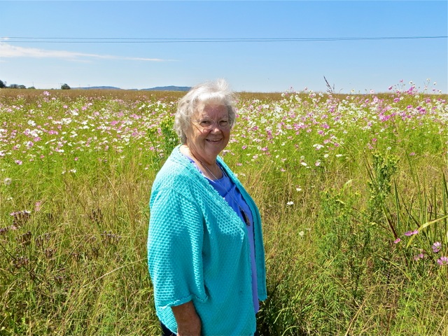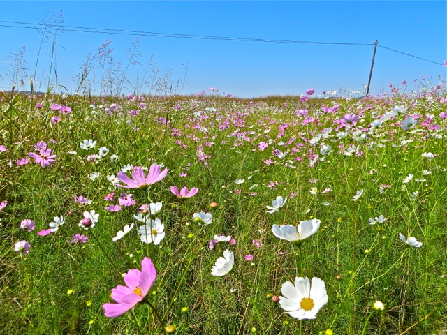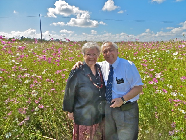 Since we dropped one of our riders off only a couple of kilometers from that field we decided to duplicate the experience . We found that the area we were in last year was almost barren of blooms but just a few hundred feet down the road there was another field. Since elder Knowles was not along only Mary got in these pictures – I call it my beautiful rose among the cosmos.
