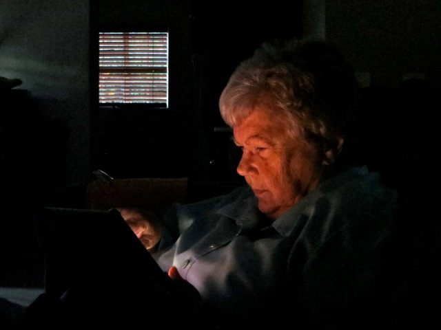Last night we were sitting in the living room when the electricity went off – we did not realize that load shedding was still going on. When it first went off it was still light but a hour or so later I looked over and noticed Mary was only illuminated by the glow of her iPad. I thought it was a perfect for a picture.