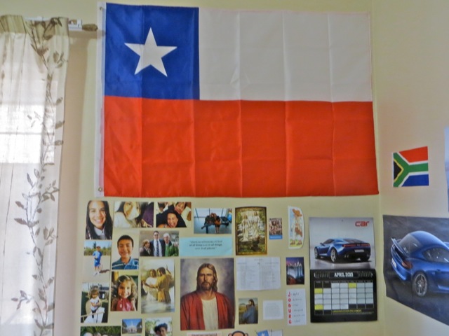 The pictures above are of elders Barton and Alvial looking their sharpest before leaving to see the president. Each missionary has a study desk and most of the personalize their spaces with pictures from home. Hopefully they do not include a picture of the girl they left behind! Elder Alvial is from Chile so he proudly displays his country’s flag. Elder Barton has a large US flag displayed but it is on the side wall so is not visible in this picture. Notice the savior’s picture is included in both display.