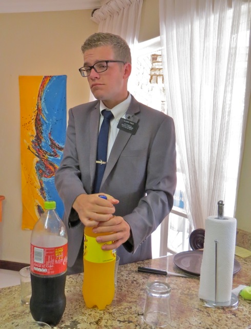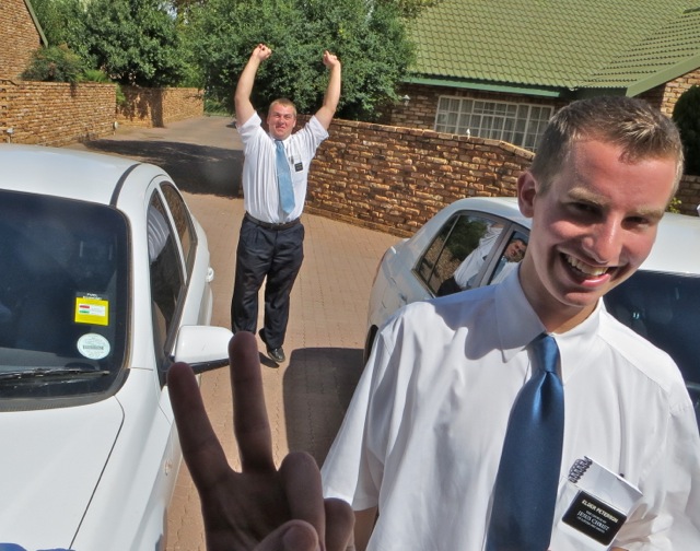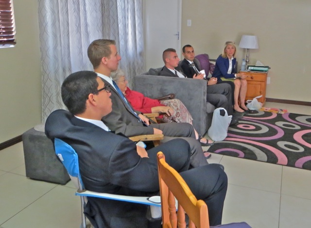 Now for the long story that made the morning pass slowly. Our Ikageng elders’ washing machine would not work so a repair man was supposed to come this morning to fix it. Since the elders needed to be at our flat to be interviewed by president Dunn, I got to sit in their flat and wait for him to arrive. I sat for about 3 hours before giving up and coming back to our flat just in time to take a few pictures of the elders before they and president and sister Dunn left to go to the mall to had out passalong cards.
