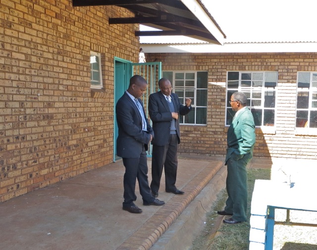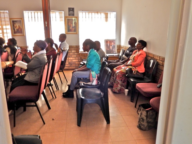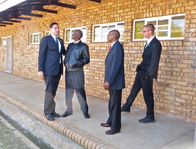 Sisters Kruger, Mogapi, and Lerefolo hold a quick Primary presidency meeting. While a few of the brethren gather during the break between sessions.