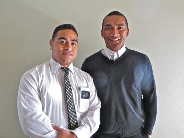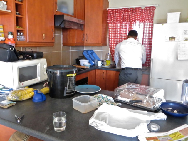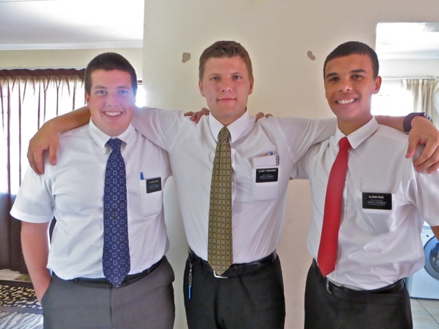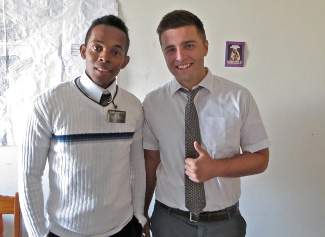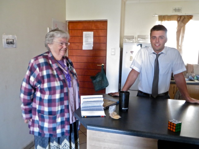 The Vaal Zone leaders – elder Tekurio and elder Togiatomai. Since the guard at the gate would not let us in without contacting one of the flats, the ZLs had a little warning about us coming so elder Tekurio was busy washing dishes when we went in.