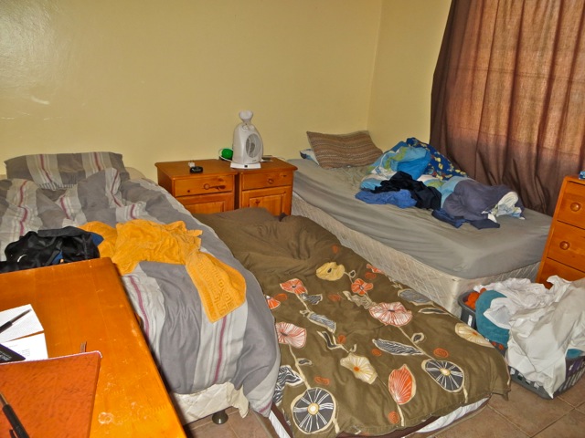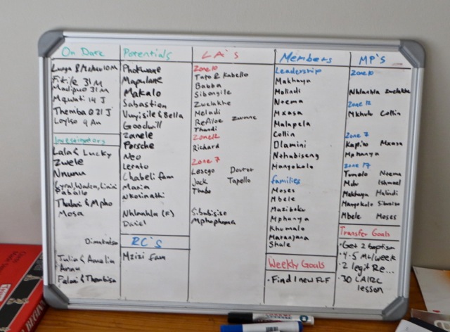 The Sebokeng 2 flat elders -Â Savage, Neuenschwander – was well kept up and was just a little messy but not dirty. Elder Savage was trained by elder Clegg and so i sent the pictures we took off to sister Clegg to forward to brother and sister Savage. I know parents – especially mothers – are alway glad to get photos of their missionary sons and their surroundings. Their whiteboard shows that they are keeping very busy and have a couple of investigators on date for the month.