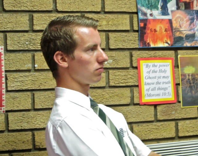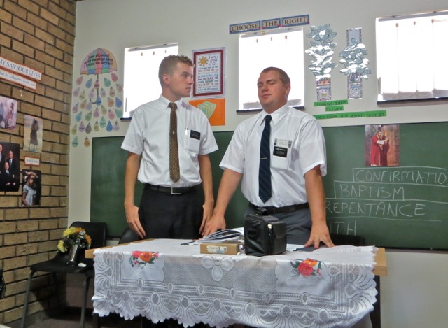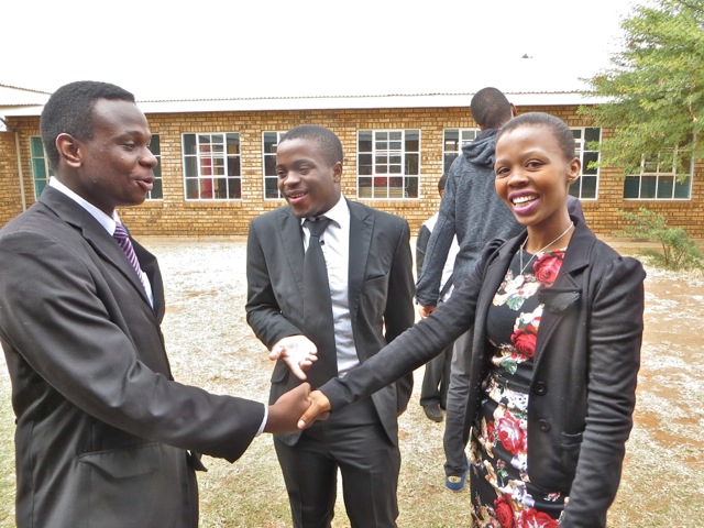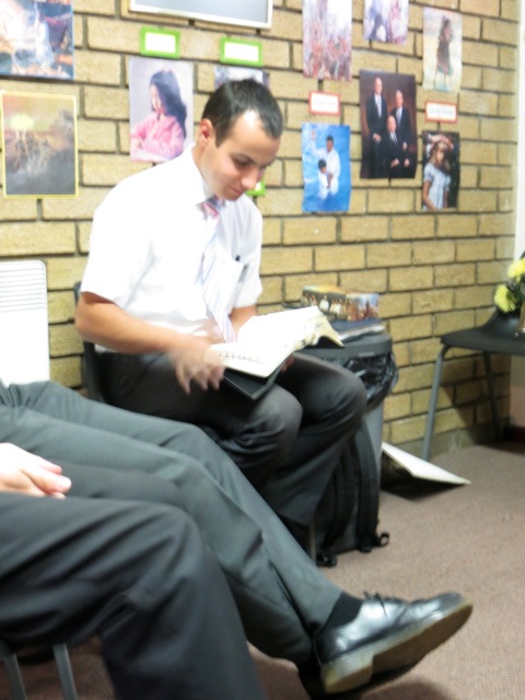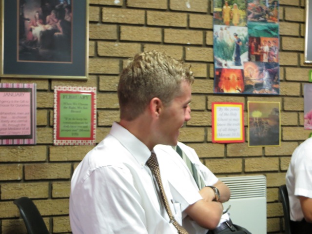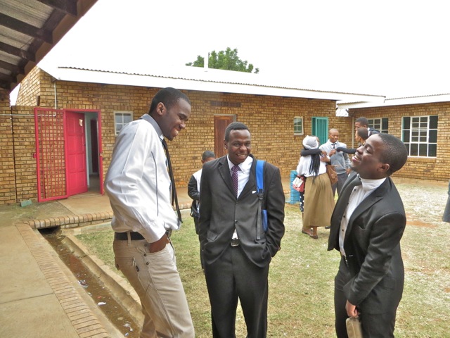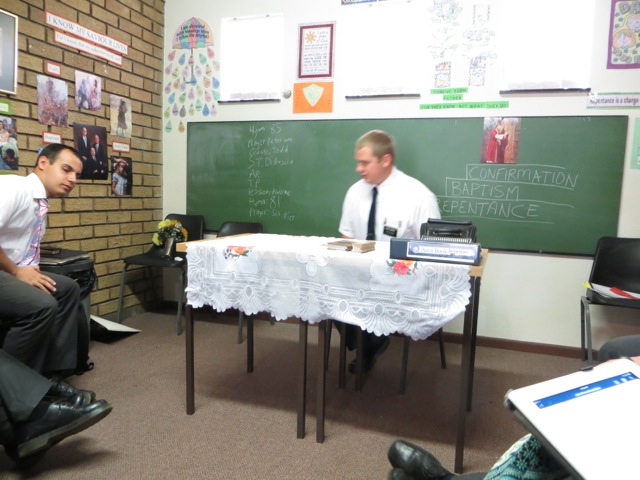 Brother Gomoleno is talking to brothers Tinashe and Kenny. Later brother Gomoleno received the Aaronic Priesthood and was ordained a Priest by brother  Kenny. I got Mary’s back as she passed brother Andries Louw. I have no idea who he was about to shake hands with.