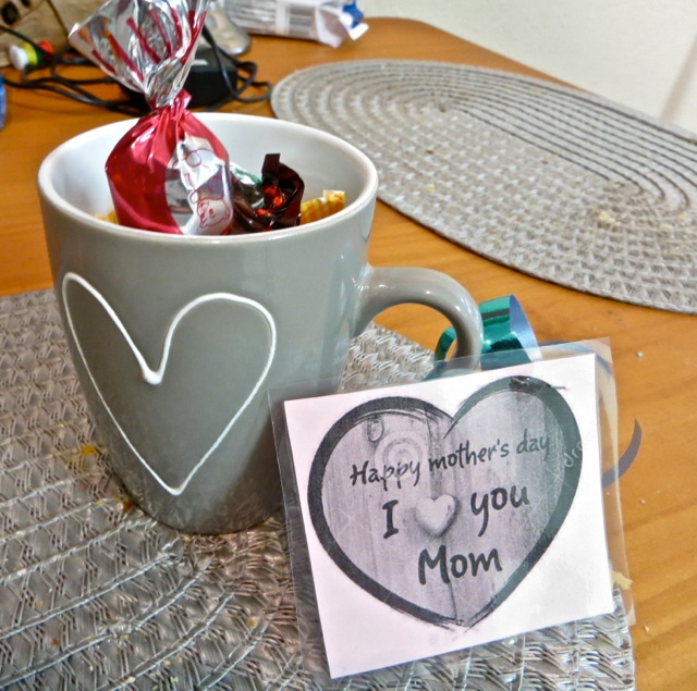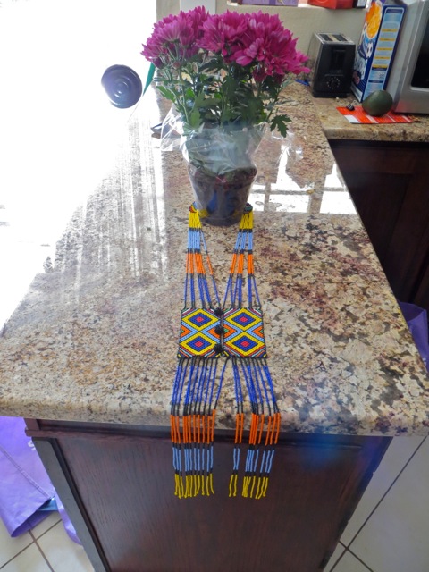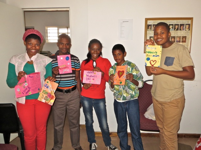 On Saturday Mary taught Seminary and then had a fun activity for the youth who came. They made Mother’s Day cards so they could give them to their moms. President Kwaikwai came in and borrowed a card so he could be in the picture. Â When Mary got home she found this African neckless and flowers as my Mother’s Day presents. While I was shopping for them load shedding kicked in and so I got to buy the flowers by candlelight – the poor florist was packed with customers and the had no way to process credit cards. Since I had the exact amount of my purchase it did not hold me up at all.
