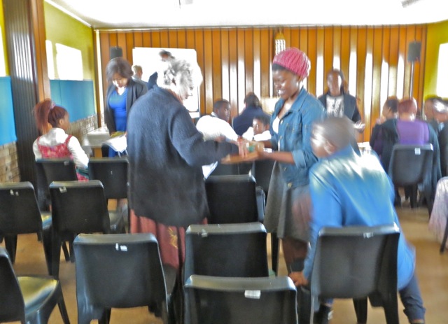 Sister Mathapelo Lekebe smiles as Bongani looks on. The elders get one more picture with a young lady – sister Kujane. I do not know why elder Barton looks the way he does…since it was Fast Sunday maybe it is something he did not eat. Below is the goodies that the Primary made to give to the Moms.