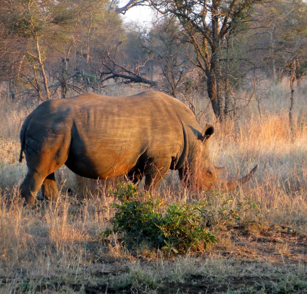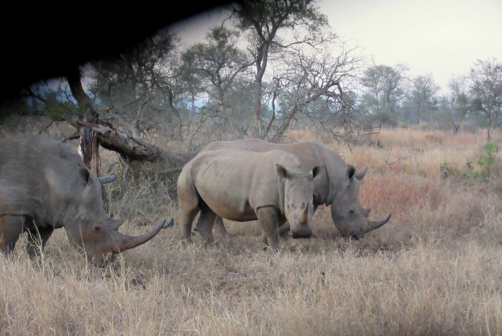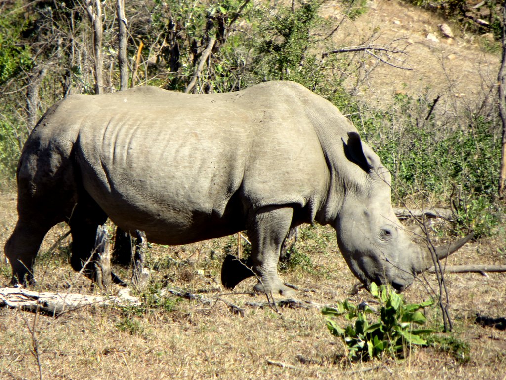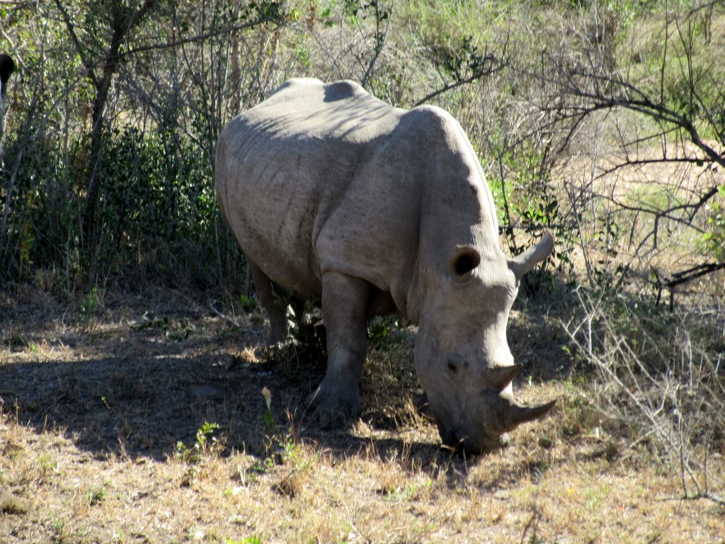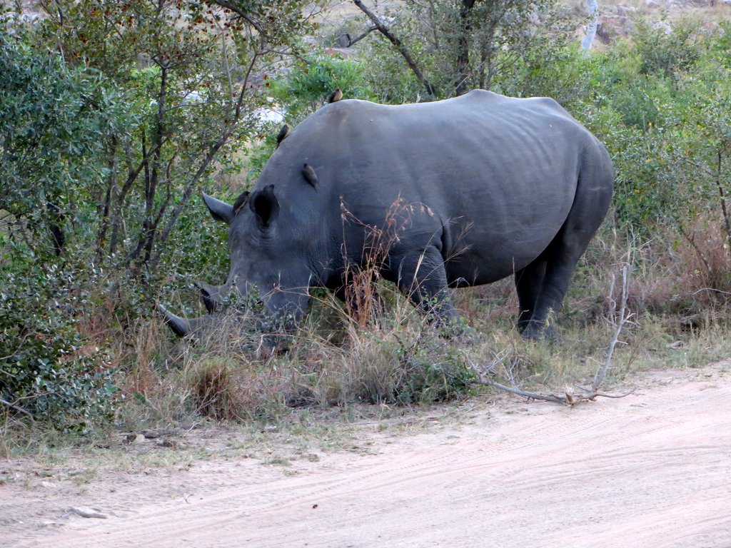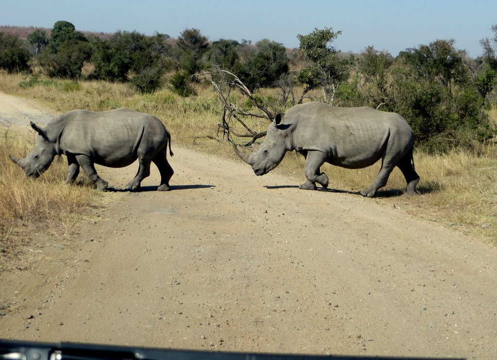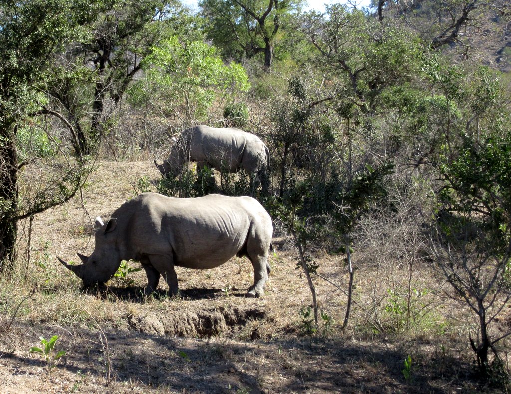 We saw tons – no pun intended – of white rhinos but of course no black rhinos…people claim to have seen them but no one has a photo that they took – “it was too far away” – it went into the bush before I could get a shot” etc. I think black rhino sightings are a myth. On a game drive during our first mission to South Africa one of the guides pointed out across the plains to a disappearing dot and said “There goes a black rhino” – right!