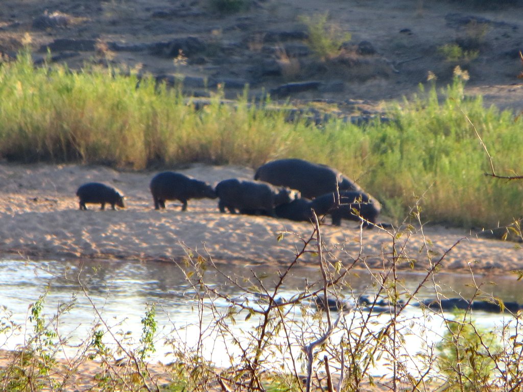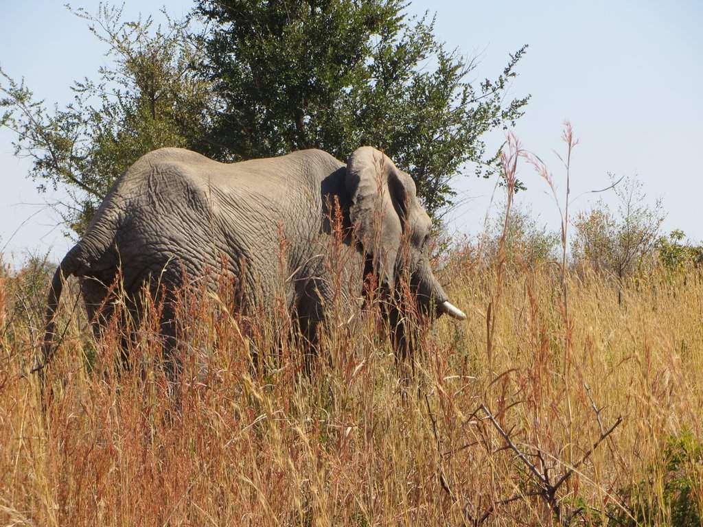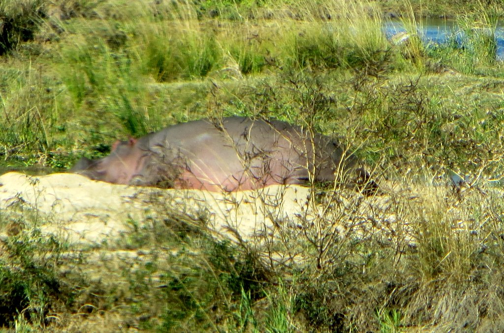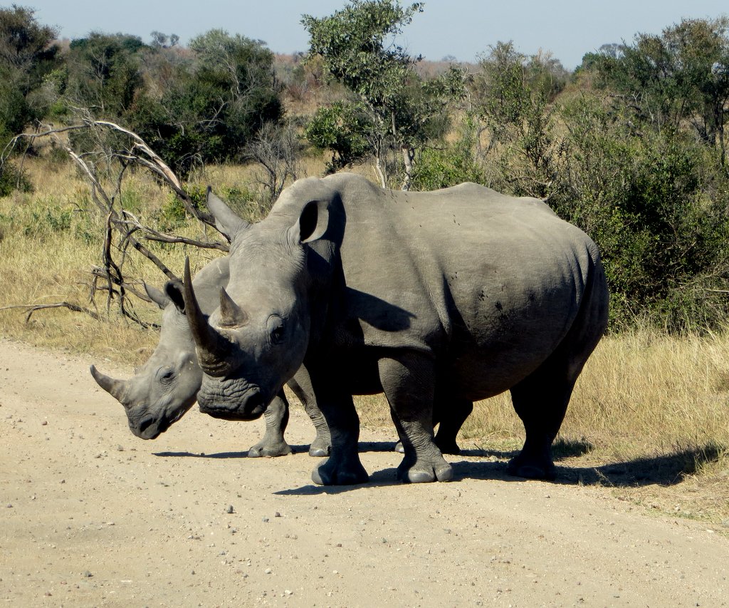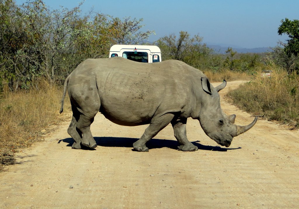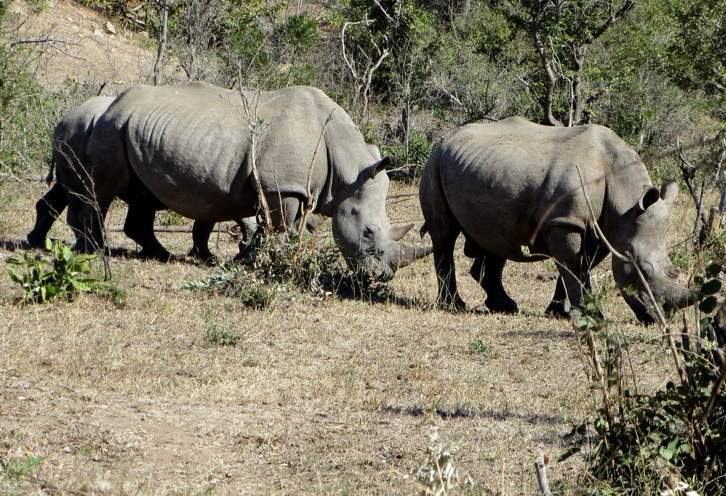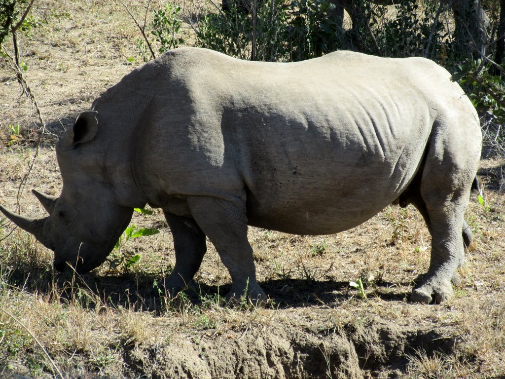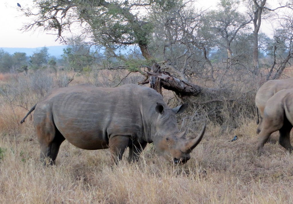 We saw tons – no pun intended – of white rhinos but of course no black rhinos…people claim to have seen them but no one has a photo that they took – “it was too far away” – it went into the bush before I could get a shot” etc. I think black rhino sightings are a myth. On a game drive during our first mission to South Africa one of the guides pointed out across the plains to a disappearing dot and said “There goes a black rhino” – right!