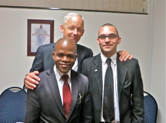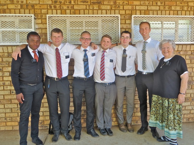 After the reports, the lesson and of course the brownies that Mary made for treats we went outside for a district photo. Â From left to right elders Khwela, Turauskis, Hentunen, Wild, McCartney and Bergman – oh and o course Mary.