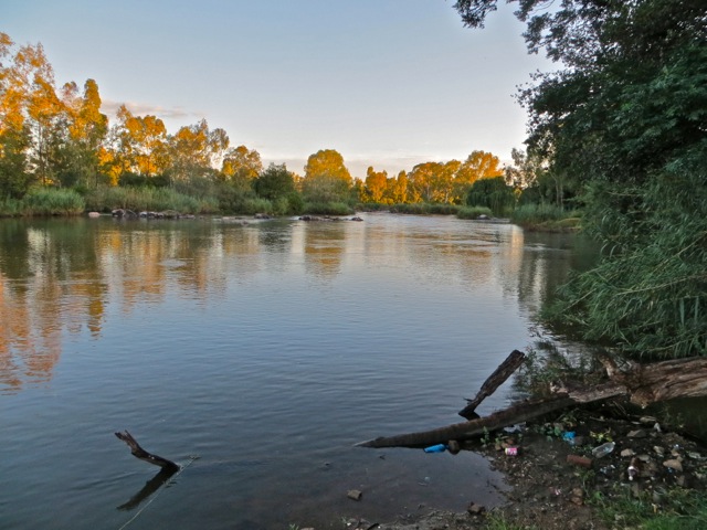 The 1st of February was very busy for us. It started at 5:30 when we left for Parys to pick up sister Bobbi so she could attend church. While we were waiting for her and Louis to get back from their walk I went down to the Vaal River and took these pictures. It was about 6:15 and the sun was just touching the tops of the trees. It was very quiet and beautiful. The drive both ways was also peaceful and the landscape was amazing as the day started.