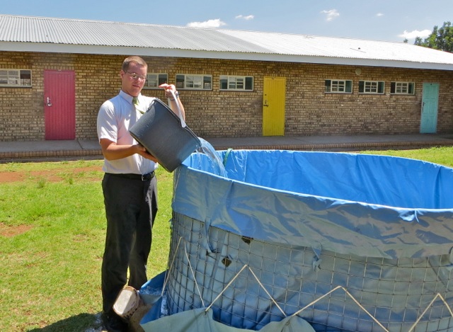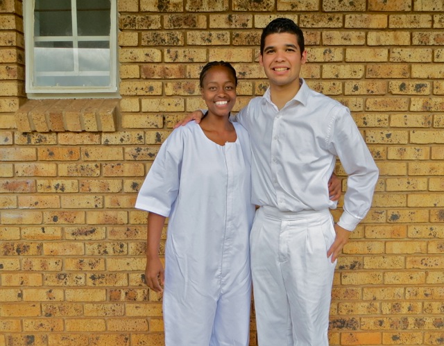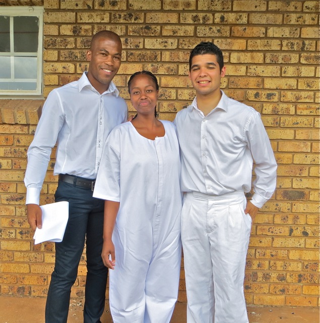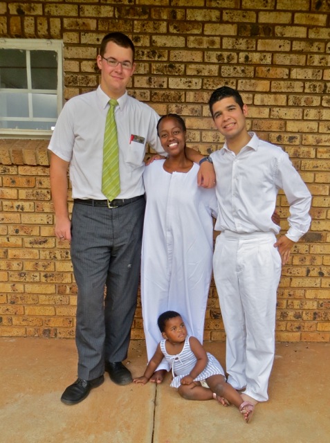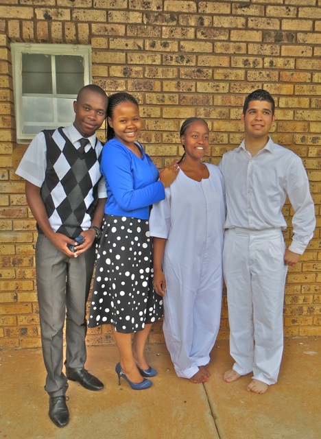 When we went to Klerksdorp yesterday elder Pier messed up and got a baptism suit that was way to big for sister Mpho. Elder Liera helped her roll up the legs so she did not trip and fall on her way to be baptized with Mary and Kea making suer he does it correctly. Â They were joined by Omphile and Kea.