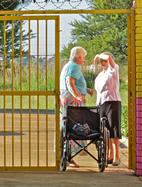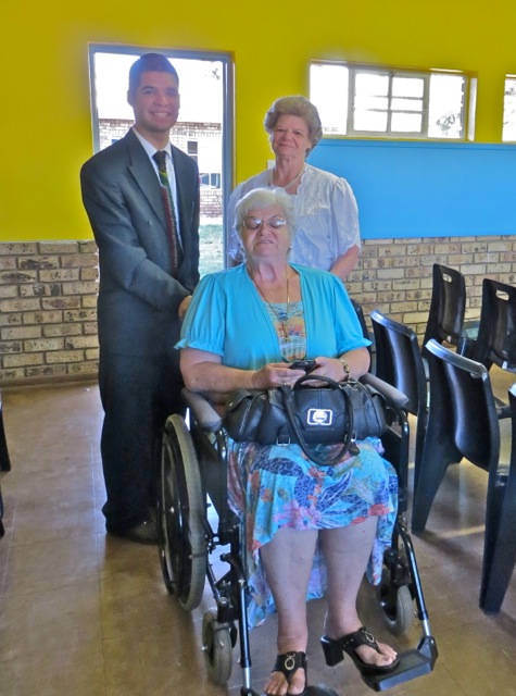 Sister Bobbi had not been to a sacrament meeting in Ikageng in years so she was greeted by many sisters and some brothers who had known her since the time she attended regularly. Sister Brummer is a long time friend and they enjoyed speaking if Afrikaans. Elder Liera joined in helping with her chair.