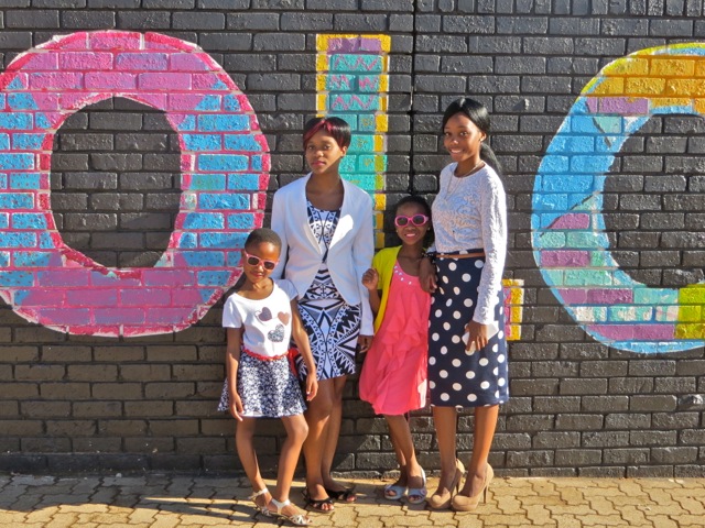 The Kujane sisters were joined by a new member for a picture against the colorful wall. Brother Omphile is the second counselor in the the branch presidency and was happy that sister Kea was back in school so they did not need to carry on their courtship long distance.